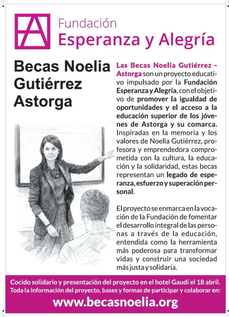 El pasado sábado 18 de abril tuvo lugar en Hotel Gaudí la presentación oficial del Proyecto Becas Noelia, una iniciativa solidaria promovida por la Fundación Esperanza y Alegría con el objetivo de apoyar a jóvenes de Astorga y su comarca en el acceso a estudios universitarios.
