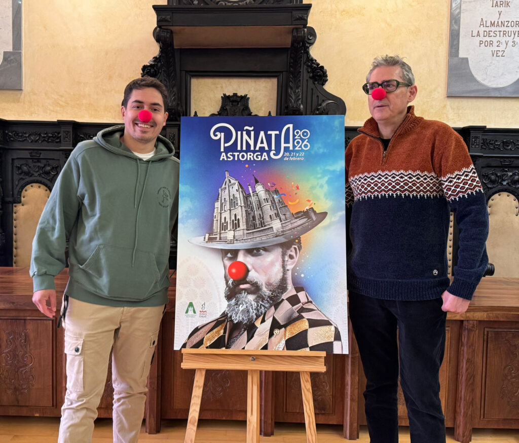 El cartel de Piñata, la versión astorgana del Carnaval, se presentaba ayer en el Ayuntamiento. El autor, el diseñador astorgano César Núñez, ha querido hacer partícipe a Gaudí, cuyo centenario se celebra, «carnavalizándolo» con una bola roja en la nariz y reconvirtiendo su sombrero en la imagen del palacio.