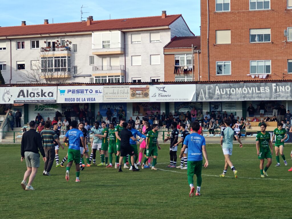 En un último intento, Lago sacaba a Mario por Ayub buscando más empuje y frescura en ataque mientras el crono corría en contra de los verdes. Con seis minutos de añadido, el colegiado, muy discutido durante todo el encuentro, sacaba la segunda amarilla y expulsaba a Jesu en una falta más que dudosa que hizo enfadar aún más a la grada. Con el 3-4 los visitantes pedían la hora mientras el Astorga intentaba llegar antes de un pitido final que dio el pistoletazo de salida a una tangana entre ambos conjuntos y reproches al árbitro. Parte de la hinchada echó más leña al fuego y fue necesaria la presencia de la Policía Nacional para calmar los ánimos.