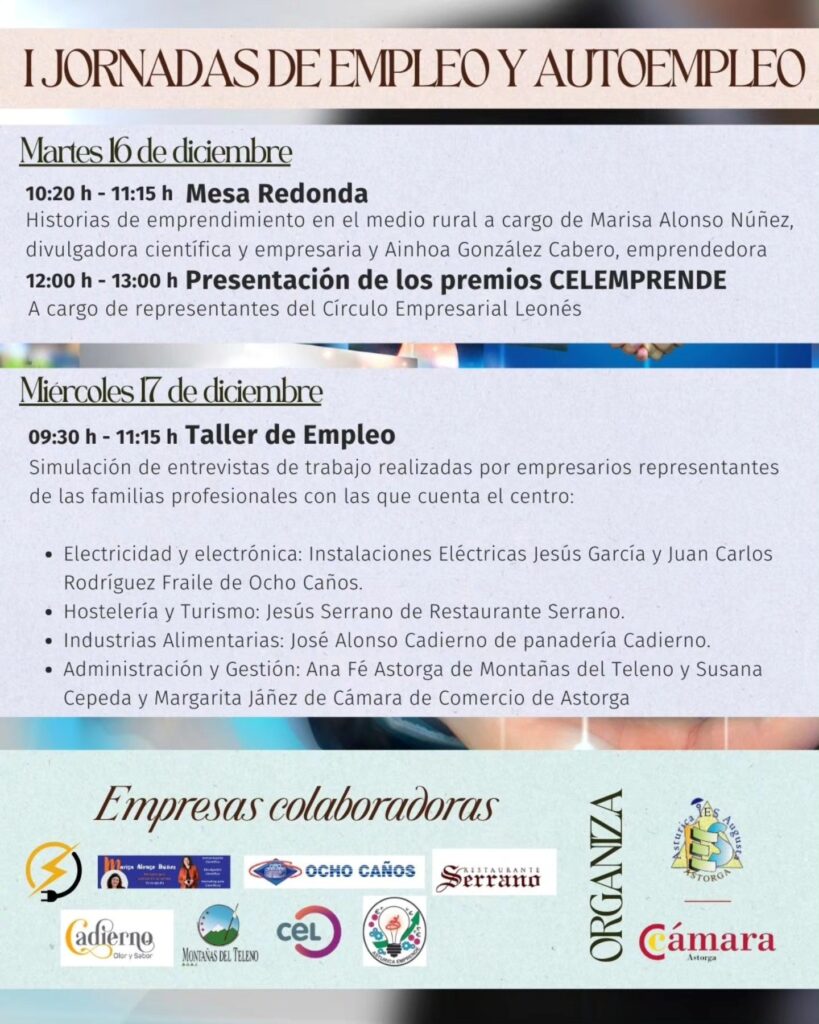 El IES Asturica Augusta, en colaboración con la Cámara de Comercio de Astorga, organiza las primeras Jornadas de Empleo y Autoempleo que se desarrollarán los días 16 y 17 de diciembre con el foco puesto en el autoempleo y la realidad del mundo laboral para los más jóvenes.