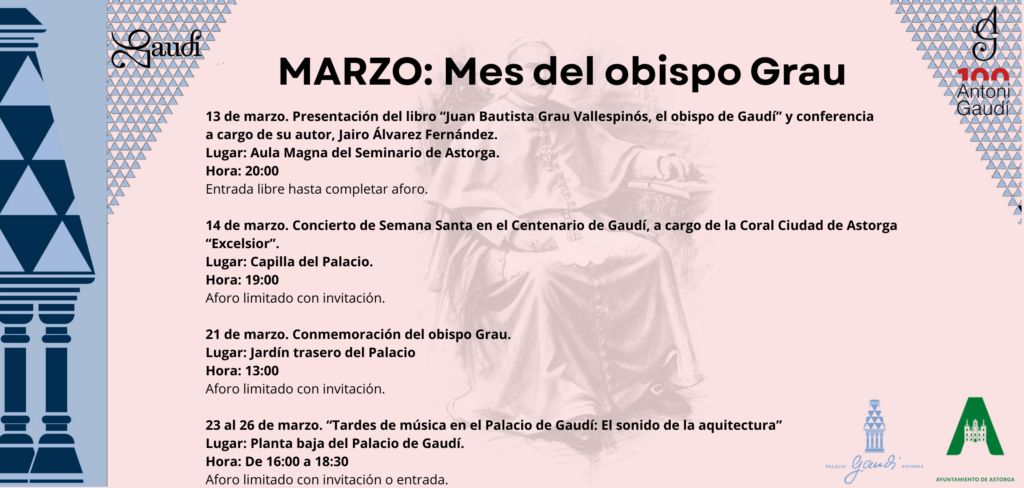 Entre ellas destaca la presentación del libro “Juan Bautista Grau y Vallespinós: el obispo de Gaudí”, de Jairo Álvarez Fernández, que tendrá lugar el viernes 13 de marzo en el aula magna del Seminario. Una obra que profundiza en la figura del prelado impulsor del Palacio y en su decisiva relación con Gaudí.