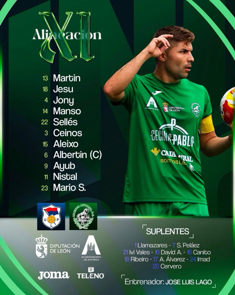 El Astorga jugó de inicio con Martín, Jesu, Manso, Jony, Selles, Javi Álvarez, Cabral, Ceinos, Albertín, Ayub y Mario. Ya en el segundo tiempo Adri relevó a Javi Álvarez; David a Manso y en otra ventana Cervero y Canito saltaron al campo en lugar de Cabral y Mario y para acabar buscando gol sustituyendo a Jesu, que se retiró con molestias por Ivi Vales.