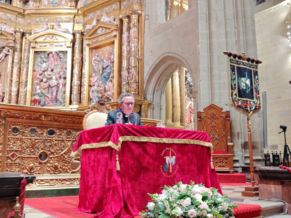 El administrador diocesano en sede vacante arrancó su pregón con las palabras de Lucas: «Es verdad, ha resucitado el Señor» recordando que «la afirmación de la resurrección del Señor es la gran exclamación a la que toda celebración de la Semana Santa debe conducir. Sin ella nada tendría sentido. Con ella todo recupera su razón de ser. Si Cristo está muerto, si sólo nos quedan su mensaje y sus palabras, sus obras y milagros, pero él no está, todo se desvanece. Sólo estaríamos haciendo representaciones, obras de teatro por las calles, performances con siglos de historia, pero al final recuerdos de un pasado ya extinguido que tan solo pervive en nuestros recuerdos. Pero si Cristo está vivo, si ha resucitado, entonces cada paso de los braceros, cada indicación de los gobernadores de los pasos, cada decisión sobre qué procesiones realizar, cómo llevarlas a cabo o cómo adornar el paso, entonces todo habla de Dios, de un Dios vivo que sigue entre nosotros. En la Semana Santa nada podemos decidir por nosotros mismos, sin contar con Dios. Dios es el actor principal de este drama que expresa la historia de un amor, el amor de Dios por el hombre, por cada uno de nosotros. La pasión de Cristo, su muerte y resurrección son la unión perfecta y redentora de Cristo con la historia de cada persona humana. Dios es el centro de la Semana Santa, no nosotros. Celebraciones litúrgicas y procesiones solemnes deben realizarse y vivirse de tal modo que sirvan a su objetivo primigenio, favorecer el encuentro del hombre con Dios y ayudar a expresarlo y a vivirlo».