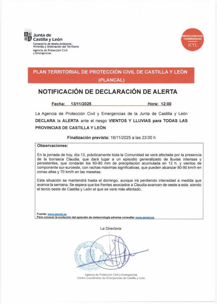 Protección Civil de la Junta de Castilla y León declara la alerta ante la previsión de fenómenos meteorológicos adversos, vientos y lluvias, desde las 12:00 horas de hoy, jueves 13 de noviembre, y hasta el próximo domingo, día 16, a las 23:00 horas, para todas las provincias.