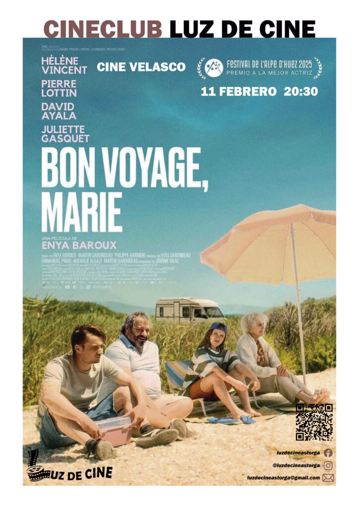 El Cine Club ‘Luz de Cine’ de Astorga proyecta este miércoles, 11 de febrero a las 20,30 horas, la película ‘Bon voyage, Marie’ de la directora francesa Enya Baroux. Estrenada en 2025, la obra llega a la pantalla del Cine Velasco como una de las favoritas de los socios y socias que la han votado de forma mayoritoria en la encuesta con las propuestas para el primer trimestre de este 2026.