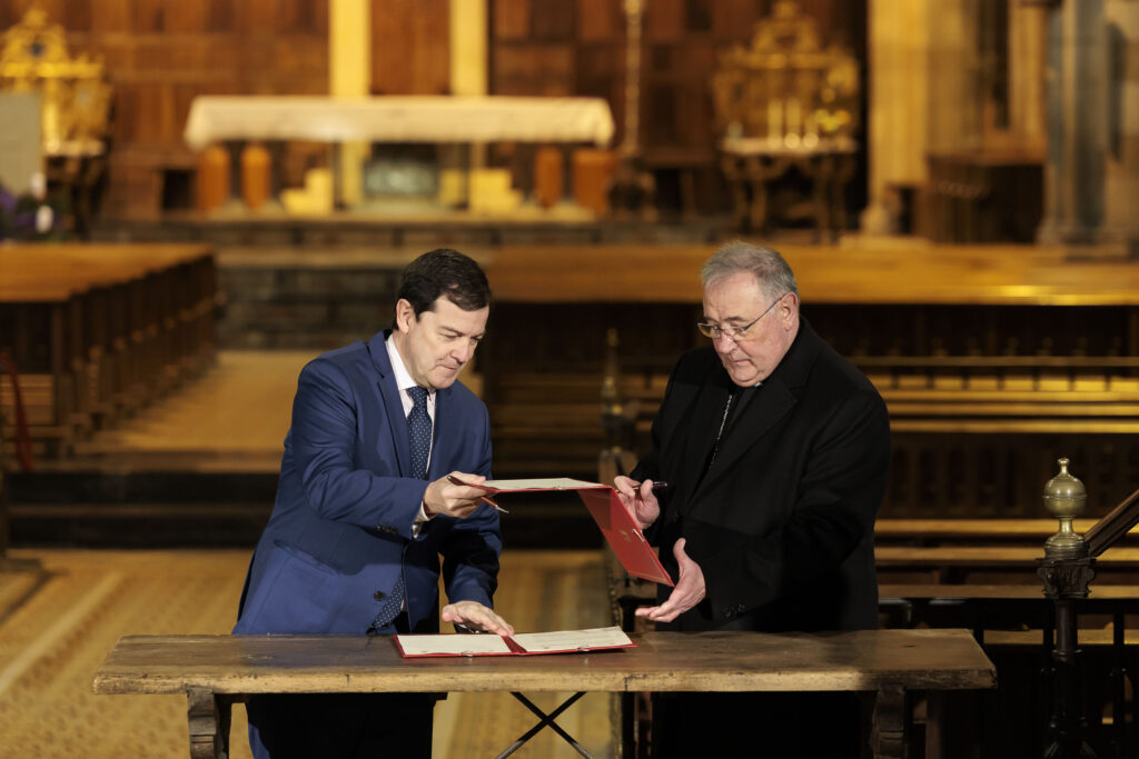 El presidente de la Junta de Castilla y León, Alfonso Fernández Mañueco, ha anunciado hoy una inversión global de 11 millones de euros destinada a impulsar nuevas actuaciones de restauración y conservación en la Catedral de León, coincidiendo con la firma de un protocolo de colaboración entre la Junta y el Cabildo de la ‘Pulchra Leonina’. Durante el acto, Mañueco ha recordado que la Catedral, primer edificio de la Comunidad declarado Monumento Nacional, ocupa un lugar preferente entre los bienes de máxima categoría del patrimonio cultural de Castilla y León, y ha subrayado la responsabilidad colectiva de mantener viva esta joya inigualable.