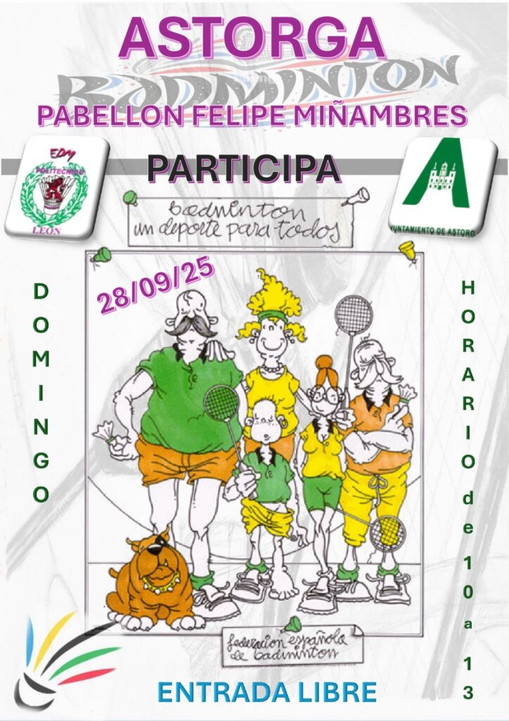 En esta ocasión y con el fin de promover la afición por esta disciplina, el domingo se ha programado una jornada de puertas abiertas para practicar bádminton en familia de 10 a 13 horas en el pabellón, una cita a la que invitan a participar a todos los astorganos. “Utilizaremos las pistas del sábado para que las familias astorganas vengan a probar este deporte porque queremos que siga creciendo, que se pueda crear una escuela en la ciudad para que se una a los juegos escolares que ya se disputan en León, Ponferrada, Toral de los Vados y Bembibre con unos 120 niños y niñas en la provincia”.