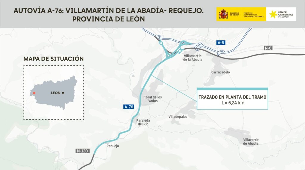 El Ministerio de Transportes y Movilidad Sostenible ha aprobado el expediente de información pública y ha aprobado definitivamente el proyecto de construcción del primer tramo de la autovía A-76 entre Villamartín de la Abadía y Requejo, en la provincia de León, con un presupuesto estimado de 133,5 millones de euros (IVA incluido). La resolución de aprobación se publicará próximamente en el Boletín Oficial del Estado (BOE).