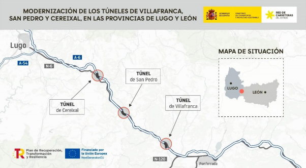 El Ministerio de Transportes y Movilidad Sostenible avanza en la ejecución de las obras de mejora y modernización de varios túneles del puerto de Piedrafita, entre los km 407 y 464,5 de la autovía A-6: Cereixal, Doncos, San Pedro y Piedrafita, en la provincia de Lugo; y Trabadelo, La Escrita y Villafranca en la provincia de León. Las obras, en su totalidad, cuentan con un presupuesto de 22,7 millones de euros (IVA incluido) con cargo a los fondos europeos del Plan de Recuperación, Transformación y Resiliencia (PRTR).